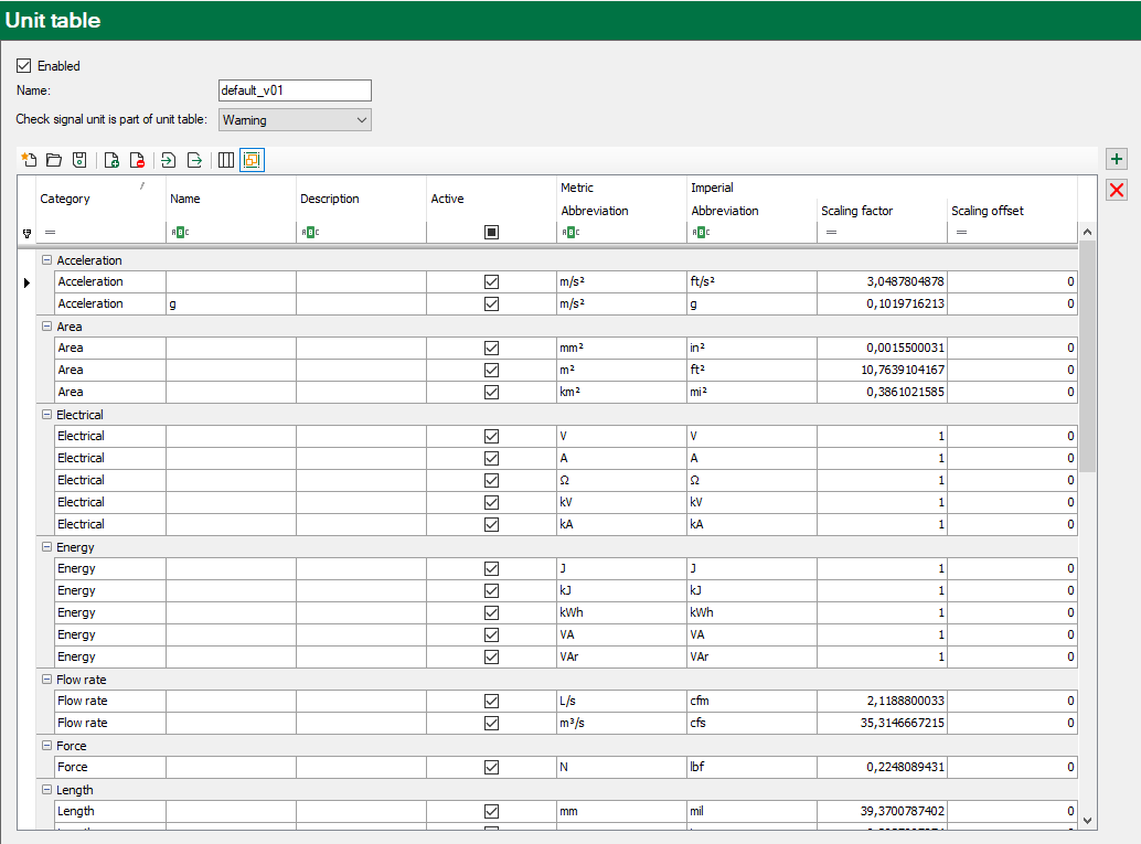 The table consists of unit systems and units. One of the unit systems is the primary unit system (standard table: metric). For the other unit system(s) there are additional columns with scaling factor and scaling offset containing the values for the conversion. Optionally, you can open test columns to verify the conversion with sample values.