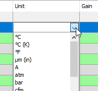 If you have enabled the unit table (see Configuring and enabling the unit table), the units are available for selection in the signal tables in the Unit column. You can either select a unit from the unit table or you can enter another unit into the field.