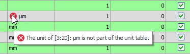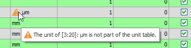 Depending on the setting for checking the units, those units which are not part of the unit table will be marked with a warning or error symbol.