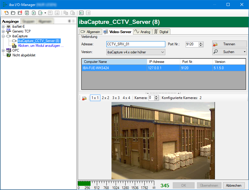 Jedes ibaCapture-Ausgabemodul muss zunächst mit dem entsprechenden ibaCapture-Server verbunden werden. Die Einstellungen dazu können Sie im Register Video-Server des Moduls vornehmen.
