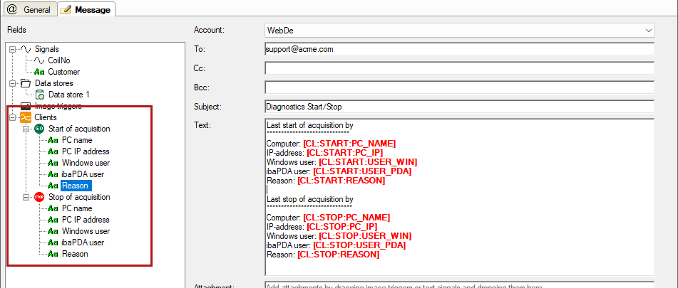 Data storages cannot be added as an attachment as data files are often too large for emailing and have not yet been concluded by ibaPDA when the email is sent.