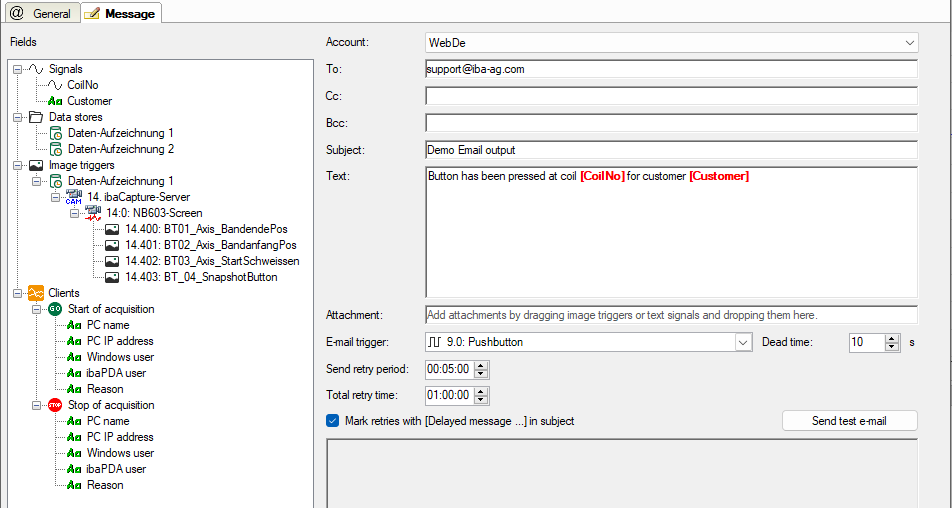 With the <Send test email> button, you can send the email without the trigger signal being triggered or the measurement running. If the measurement is not running and the configured fields have no values then the names of the fields are entered in the email.