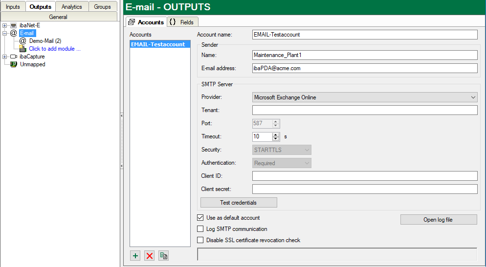 In this tab, you configure the email accounts to be used by ibaPDA to send emails.