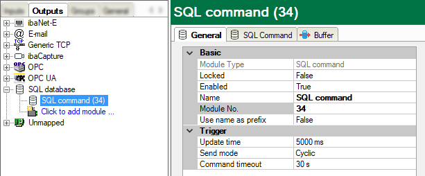 The SQL commands are configured in the Outputs tab. An SQL command module must be configured for each SQL command.