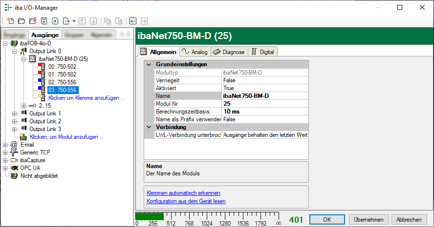Im Register Ausgänge, haben Sie die Möglichkeit digitale und analoge Signale auszugeben. Diese Ausgangssignale sind in erster Linie dazu gedacht, Ereignisse zu signalisieren, bzw. Alarme oder Warnungen auszulösen. Da ibaPDA eine große Vielfalt an Prozesssignalen bietet, können Signale aber auch verglichen, berechnet und an andere Systeme ausgegeben werden.