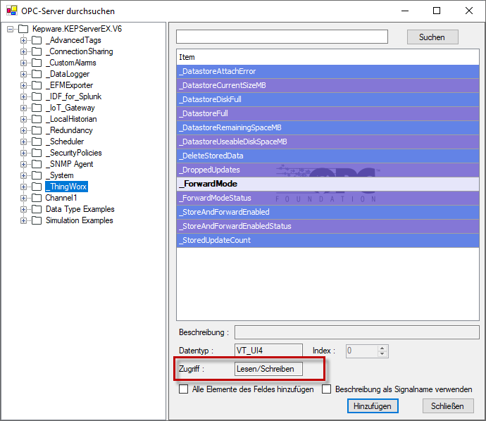 Nachdem Sie die Einstellungen vorgenommen haben, klicken Sie auf den blauen Hyperlink Verbinden am Ende des Registers. Sobald die Verbindung aufgebaut ist, können Sie auf den Hyperlink Signale hinzufügen klicken, um nach den OPC-Signalen zu suchen. Zur Auswahl stehen nur Items mit Lese-/Schreib- oder Schreibzugriff. Eine Auswahl der OPC-Items an dieser Stelle fügt sie automatisch in die richtige Signaltabelle (analog/digital) ein.