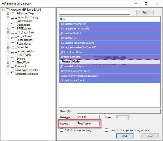 After you have made the settings, click on the blue hyperlink Connect at the bottom of the tab. As soon as the connection is established, you can click on the available hyperlink Add signals in order to browse the OPC signals. Only items with read/write or write access apply for selection. Selecting OPC items at this stage will put them automatically into the correct signal table (analog/digital).