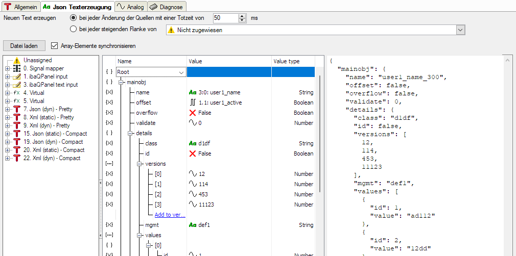 In diesem Register definieren Sie die Datenstruktur, die dann als Textquelle für die im nächsten Schritt zu erstellenden Textsignale dient.