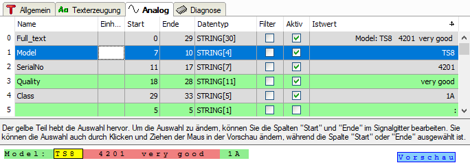 Die Konfiguration der Textsignale nehmen Sie im Register Analog vor, wie beim Modul Texttrenner beschrieben, siehe Texttrenner-Modul.