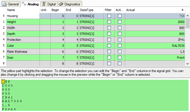 Configure the text signals in the Analog tab as described for the text splitter modules, see Text splitter module.