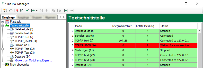 Wenn Sie den Knoten Textschnittstelle markieren, dann sehen Sie eine Übersicht über alle konfigurierten Module mit den zugehörigen Telegrammzählern und Statusinformationen.