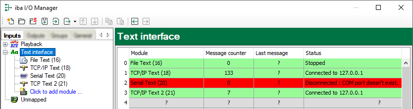 If you select the node Text interface, then you will see an overview of all configured modules with the associated telegram counters and status information.