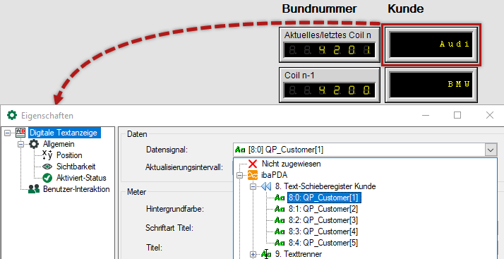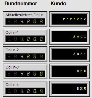 Für eine Anlage, die Stahlblech für die Automobilindustrie produziert, soll eine Anzeige mit ibaQPanel realisiert werden, die neben den Losnummern auch die Kundennamen der letzten 5 produzierten Blechbunde anzeigt. Das Textsignal "Kunde" wird in einem Text-Schieberegister angelegt. In dem bereits vorhandenen Textsignal "QP_Kunde" ist stets der zur Produktion passende Kundenname enthalten. Hier als manuelle Eingabe in ibaQPanel ausgeführt, es kann aber auch jeder andere, automatisch generierte Text sein. Das Triggersignal löst jedes Mal aus, wenn ein neues Band in die Anlage einläuft. Da die letzten 5 Bunde angezeigt werden sollen, wird die Registertiefe auf 5 eingestellt.