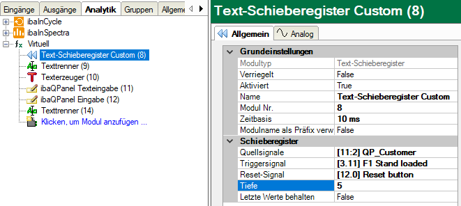 In ibaQPanel werden 5 digitale Textanzeigen projektiert, von denen jede auf eines der indizierten Schieberegister-Textsignale zugreift.