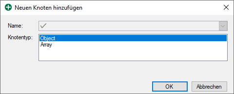 Es öffnet sich ein Dialog, in dem Sie den Root-Node als Object oder Array anlegen können. In den meisten Fällen ist der Root-Node ein Object. Wählen Sie z. B. Object und klicken Sie auf <OK>. Das Feld Name ist nicht verfügbar, sodass Sie keinen Namen eingeben können.