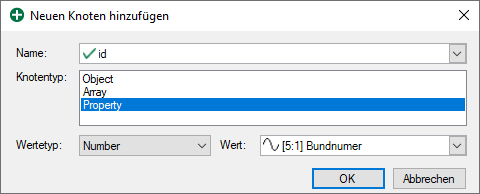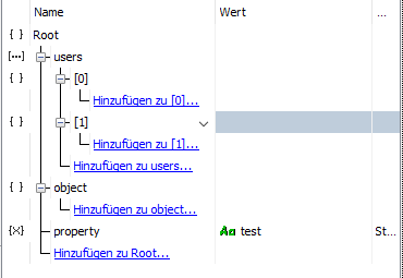 Objekten können Sie stets Knoten des Typs Object, Array oder Property hinzufügen. Im XML-Modus können Sie zusätzlich den Typ Attribute wählen. |