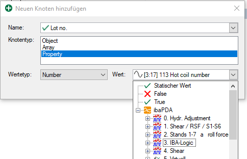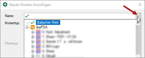 Wenn Sie ein Signal wählen wollen, klicken Sie auf den Pfeil für die Auswahlliste und wählen Sie das gewünschte Signal aus dem Signalbaum aus. Als Name des Knotens wird dann der Signalname angezeigt.
