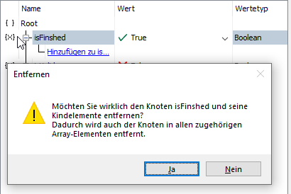 Alternativ können Sie die <Entf>-Taste drücken, wenn Sie den betreffenden Knoten in dem Datenstrukturbaum ausgewählt haben. Um ein versehentliches Löschen zu vermeiden, erfolgt ein Warnhinweis.