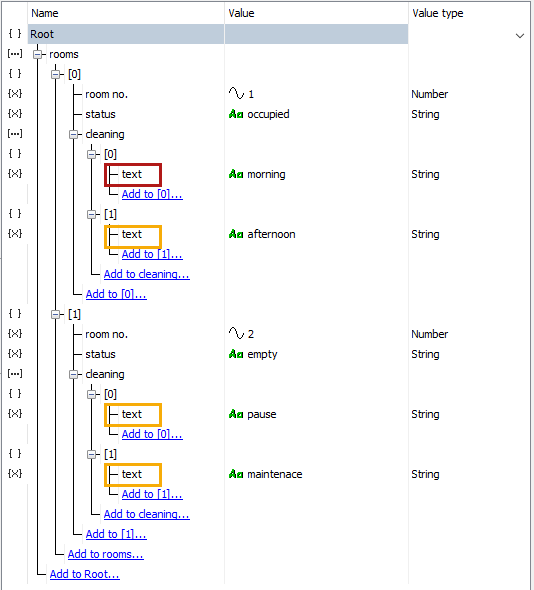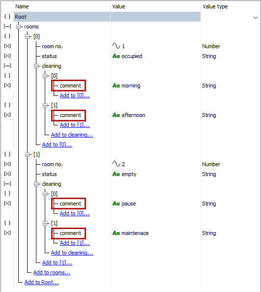 The following structure shows renaming the node “text” to “comment” in the first array item (left picture). Due to the synchronization option all other corresponding array items are renamed, too (right picture).