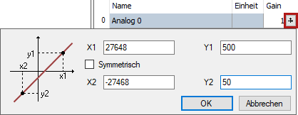 Um die Errechnung von Gain/Offset zu erleichtern, erscheint bei Klick auf das Koordinatenkreuz im Feld Gain oder Offset ein Hilfsdialog bei dem Sie lediglich zwei Stützpunkte der Geradengleichung angeben. Gain und Offset werden dann automatisch errechnet.