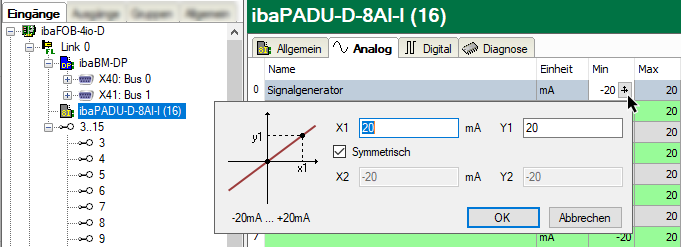 Voreingestellte Werte sind -10/+10 für die Standard-Module ibaPADU und -20/+20 für ibaPADU-8-I-Module. Dies entspricht dem Spannungsbereich realer Geräte von -10 V bis +10 V bzw. von -20 mA bis +20 mA.