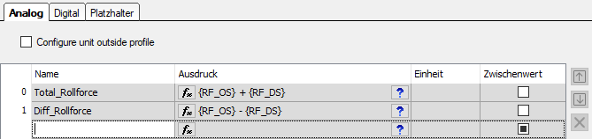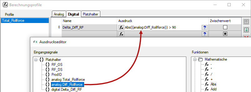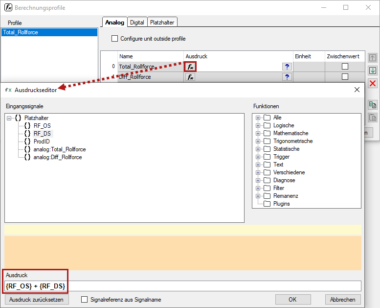 Wenn Sie das Ergebnis einer Zeile in einem anderen Ausdruck verwenden wollen, dann nutzen Sie die vordefinierten Platzhalter {analog:X} oder {digital:Y}, wobei X und Y für den Namen des Ausdrucks im Register Analog oder Digital desselben Profils stehen.