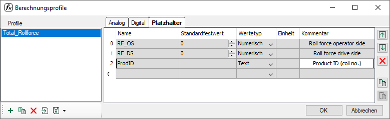 Platzhalter für die zwei Eingangsmesswerte Walzkraft Bedienseite und Walzkraft Antriebsseite sowie die Produkt-ID definieren.