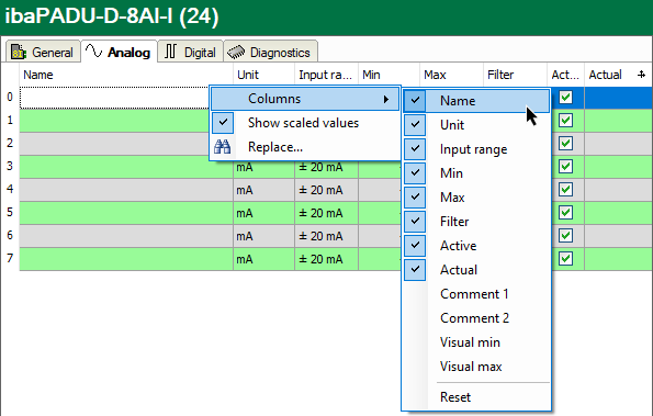 The signal tables (analog, digital) contain all the signals to be acquired by ibaPDA .