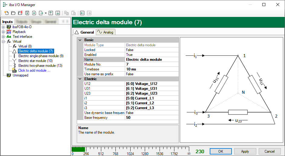 ibaPDA uses the same formulas as ibaAnalyzer to calculate the different electric values. The formulas of the single-line module are the same as the formulas of the star module, with u2, u3 and i2, i3, i4 equal to zero. The following figure shows an example for a delta module.