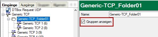 Ordner und Unterordner, die Sie im Register Eingänge oder Ausgänge angelegt haben, werden automatisch auch in das Register Gruppen übernommen. Somit steht Ihnen die von Ihnen bevorzugte Struktur auch gleich bei den Gruppen zur Verfügung. Allerdings werden Ordner gleichen Namens und Gliederungsebene aus den verschiedenen Schnittstellen als Gruppe zusammengefasst. Ein Ordner, der z. B. unter drei verschiedenen Schnittstellen angelegt wurde, erscheint im Register Gruppen nur einmal und enthält die Signale aller drei Schnittstellen.