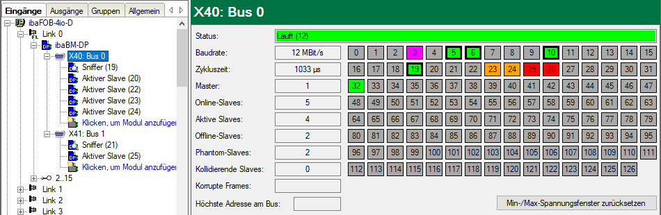 Hier werden Status- und Diagnoseinformationen für jeden angeschlossenen PROFIBUS-Strang angezeigt: