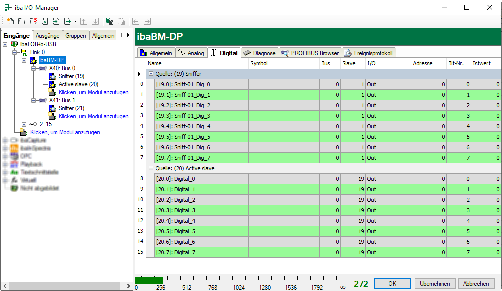 Sind in den Submodulen Digitalsignale konfiguriert und wurde die Konfiguration auf ibaBM-DP übertragen, so wird hier eine Übersicht aller erfassten Digitalsignale mit einer Online-Darstellung der aktuell erfassten Werte angezeigt.