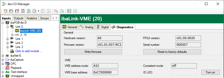 The "General" area provides information about the version and serial number of the connected ibaLink-VME board.