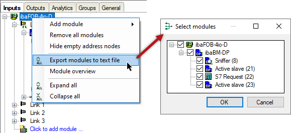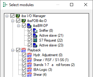 In the example below, on the left side, the ibaBM-DPM-S, Sniffer, S7 Request modules and two Active slave modules are exported. The export on the right side includes just the Sniffer module.
