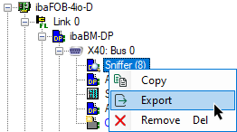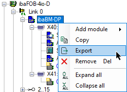 Export of single modules is possible. If there is no need to export an entire I/O configuration, you can export a single module. Just right-click on the module in the I/O Manager tree and select Export from the context menu. In case of modules and sub-ordinated sub-modules, the export consists either of the main module and all sub-modules or of the sub-module only, depending on your previously selected node.