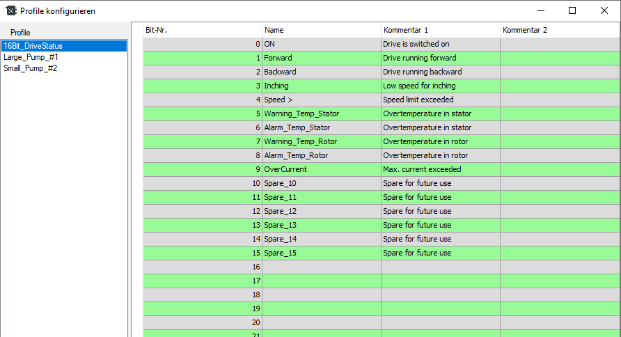 Von den Hauptantrieben einer Anlage wird jeweils ein Integer-Wert genutzt, um bis zu 16 Statusbits für den Zustand des Antriebs zu übertragen. Da es in der Anlage viele dieser Antriebe gibt, wird ein MultiDecoder-Profil erstellt, das dann für jeden passenden Antrieb verwendet werden kann.