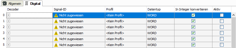 In der Spalte Signal-ID wählen Sie das Analogsignal aus, das zerlegt werden soll. Solange kein Signal zugewiesen wurde, wird standardmäßig „Nicht zugewiesen“ eingetragen. Wenn „Nicht zugewiesen“ eingetragen ist, kann der Decoder nicht aktiviert werden.