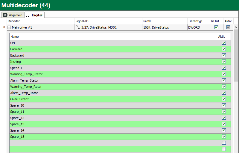 Wenn Sie die Gruppenzeile eines Decoders erweitern, sehen Sie eine Anzahl Zeilen, die der Anzahl Bits des Datentyps entspricht, bei einem Integer also 16. Eine Zeile entspricht einem Bit, also einem Digitalsignal.