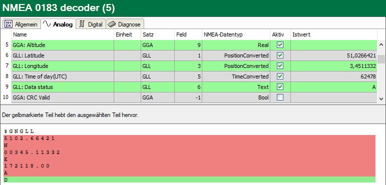 Geben Sie die Stelle im NMEA-Datensatz an, an dem das ausgewählte Signal steht. Die Felder im Datensatz sind durch Kommas getrennt.
