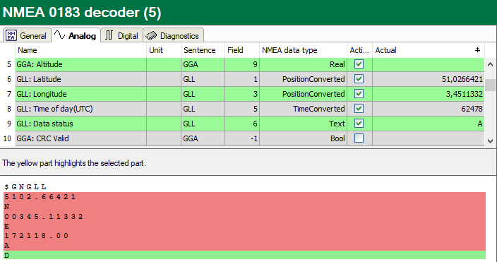 The Actual column shows you the sentence of the source signal as current values. Each line corresponds to one field of the sentence. In the Field column in the signal table, you can assign the record fields to the signals.