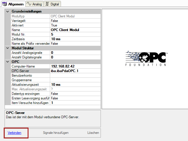 Nachdem Sie die Einstellungen für den OPC-Server im Register Allgemein vorgenommen haben, klicken Sie auf Verbinden .
