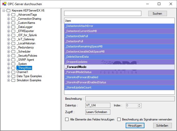 Wenn die Einstellungen korrekt sind, die Verbindung physikalisch vorhanden und der OPC-Server aktiv ist, sollte kurz darauf der Hyperlink Signale hinzufügen aktiv sein. Klicken Sie auf Signale hinzufügen .