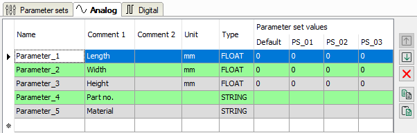 In these tabs you can define the parameters and provide the necessary values for each of the previously defined parameter sets. Each parameter set gets its own column to the right of the Default column.