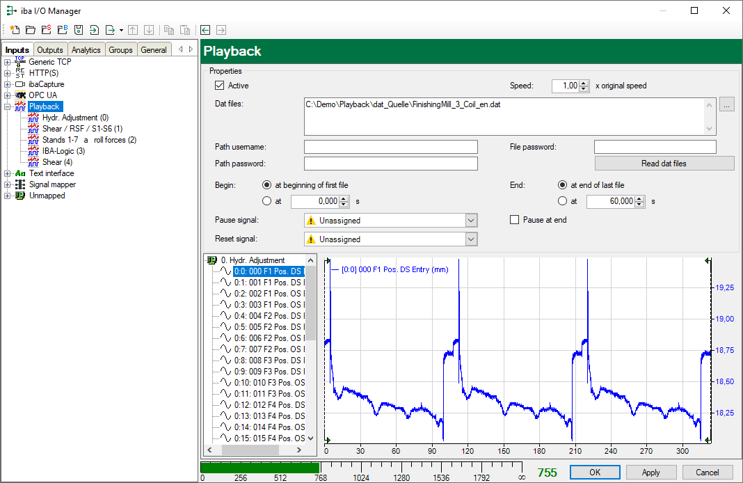 The playback interface is one of the few interfaces, which are always available even without a license key (dongle). Thus, it serves as a data source for the demo mode of ibaPDA if no real signals are available.