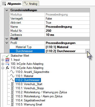 Wählen Sie hier aus der Dropdown-Liste das passende Profil aus, das die Prozessbedingung für dieses Modul beschreibt. Ohne Profil ist das Modul ungültig. Sollte noch kein Profil verfügbar sein, müssen Sie zunächst eines erstellen.