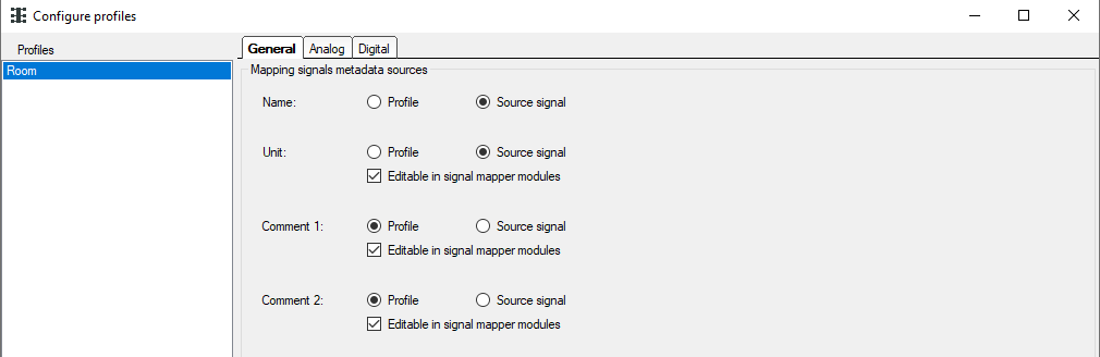 4. On the General tab of the profile decide which metadata should be adopted from the source signal and which should be retained by the profile. In this case, signal name and unit will be adopted from the source signal.