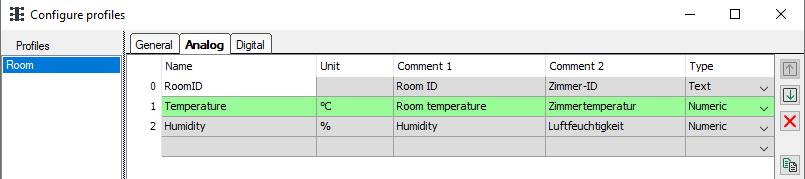 5. On the Analog tab define the analog values, which are needed for the visualization (RoomID, Temperature, Humidity).