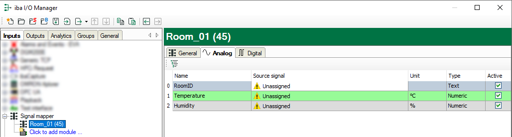8. Together with the profile the module automatically gets its Analog and Digital tabs containing the defined signals. The source signals are not assigned yet.