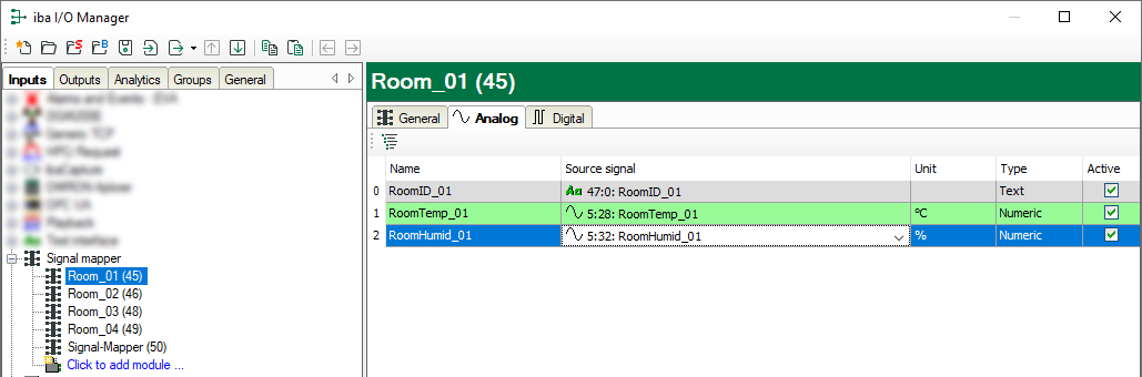 11. If the source signals are available you can assign them to the signal mapper modules on the Analog and Digital tabs. Because we have configured in the profile that the signal name should be adopted from the source signal, the signal names of the signal mapper modules change correspondingly.