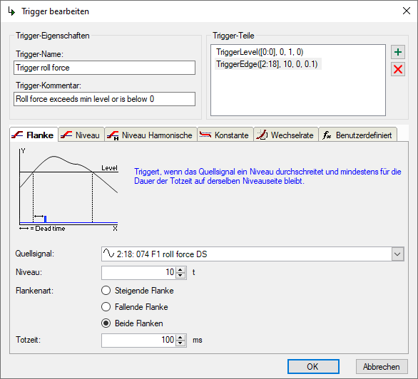 Geben Sie den Ausdruck zur Berechnung des Triggersignals ein oder erstellen Sie den Ausdruck mit Hilfe des Dialogs "Trigger bearbeiten". Öffnen Sie den Dialog über den Button <fx> im Feld "Ausdruck".